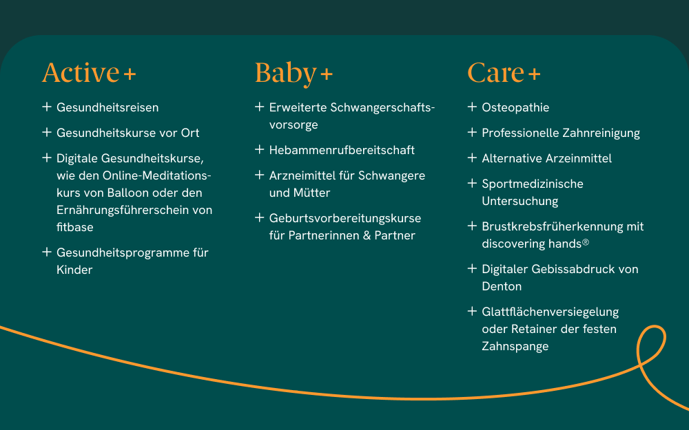 Stelle dir aus folgenden Zusatzleistungen dein persönliches Care+ Paket zusammen, für das dir bis zu 500 Euro pro Jahr zur Verfügung stehen.