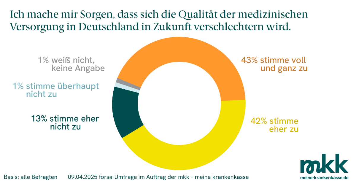 Denn die Bürger und Bürgerinnen sehen ziemlich schwarz für das Gesundheitssystem. Laut einer aktuellen Umfrage des Forsa-Instituts im Auftrag der mkk – meine krankenkasse befürchten 85 Prozent der Befragten eine Verschlechterung der medizinischen Qualität in den kommenden Jahren. Besonders stark ausgeprägt ist diese Sorge bei den gesetzlich Versicherten, von denen 86 Prozent Qualitätseinbußen erwarten. Privat Versicherte sind mit 74 Prozent etwas weniger beunruhigt.