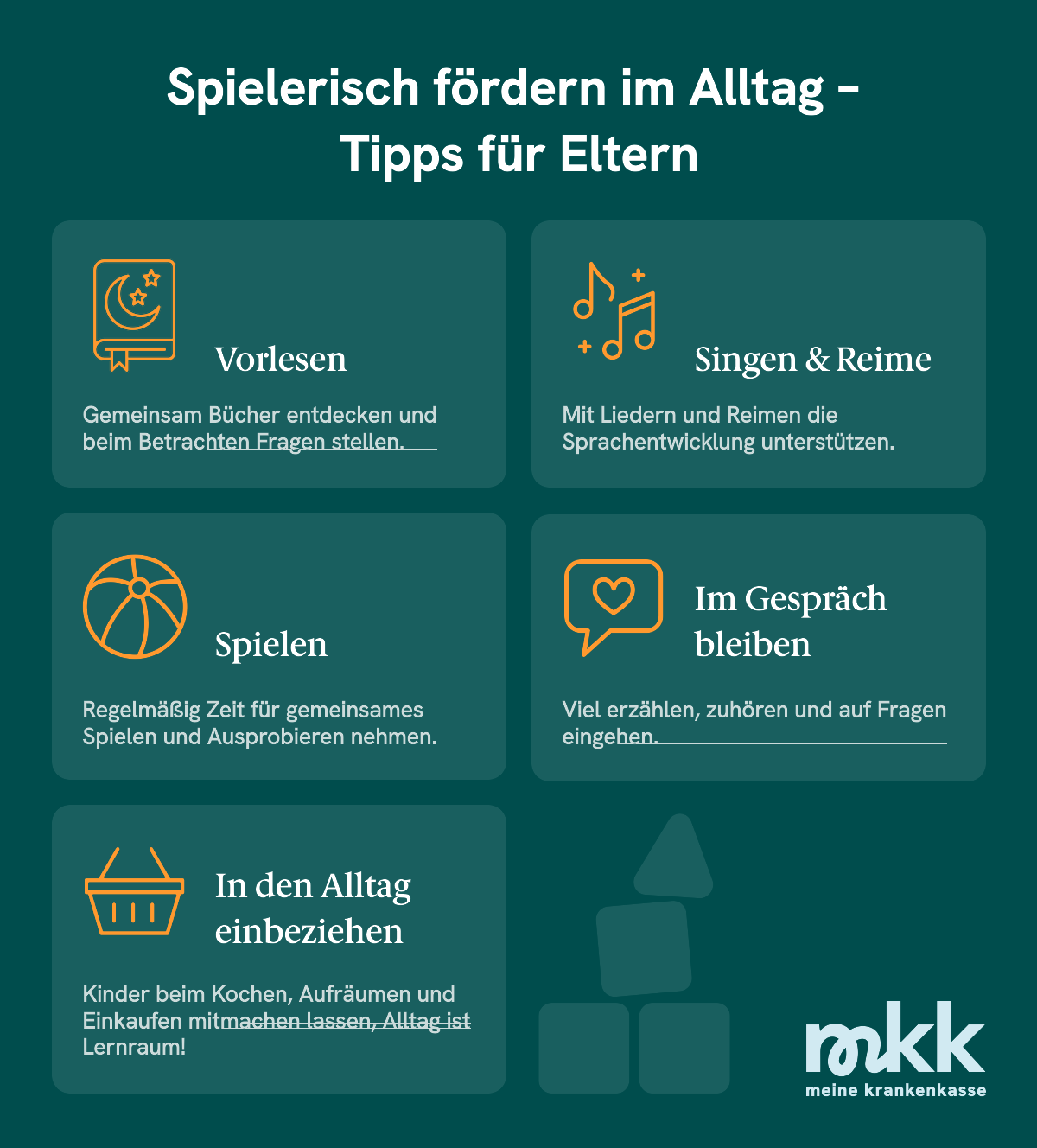 Durch gemeinsames Erzählen, aktives Zuhören und das Sprechen über alltägliche Dinge lernt dein Kind, Gefühle, Wünsche und Gedanken auszudrücken. So fällt es leichter, mit anderen in Kontakt zu kommen und sich mitzuteilen.