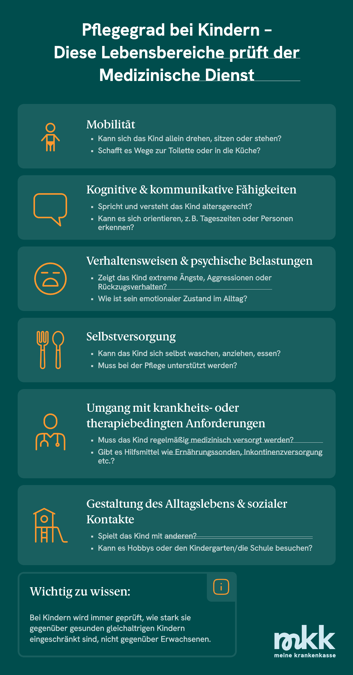 Für einen Pflegegrad ist wichtig, wie viel Unterstützung dein Kind benötigt. Das kann sich in verschiedenen Bereichen zeigen, etwa: