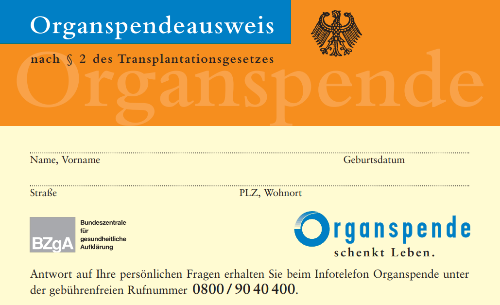 - Die verstorbene Person hat einer Organspende zu Lebzeiten zugestimmt (Organspendeausweis oder Patientenverfügung)