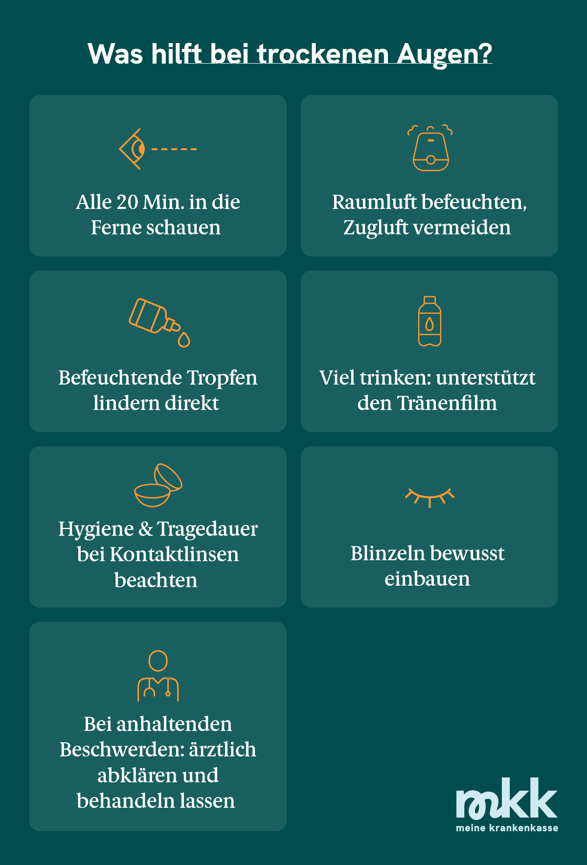 Befeuchtende Augentropfen können die Augenoberfläche kurzfristig entlasten. Auch regelmäßige Bildschirmpausen, bewusstes Blinzeln und eine ausreichende Flüssigkeitszufuhr helfen oft, die Beschwerden schnell zu lindern.