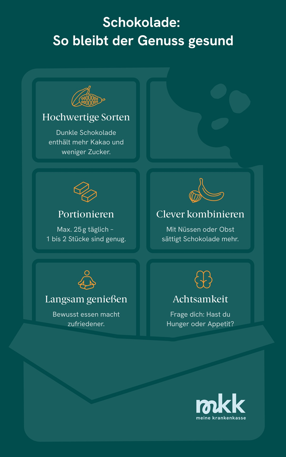 Wähle Sorten mit hohem Kakaoanteil (mindestens 70 Prozent). Sie enthalten weniger Zucker, mehr wertvolle Flavonoide und sorgen durch den intensiven Geschmack dafür, dass du automatisch weniger brauchst.
