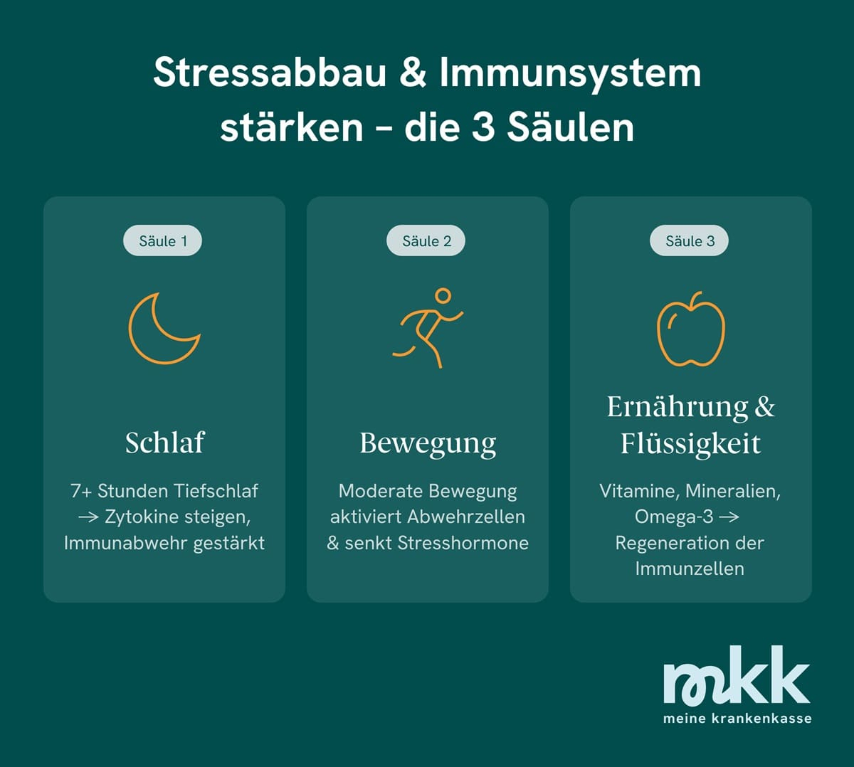 Das Ziel ist nicht, Stress komplett zu vermeiden, sondern gesunde Wege zu finden, damit umzugehen. Diese Strategien helfen, Stresshormone zu senken und das Immunsystem zu stärken: Schlaf, Bewegung und Ernährung sind die drei zentralen Säulen, die bestimmen, wie gut dein Körper auf Stress reagiert und Krankheitserreger abwehrt.