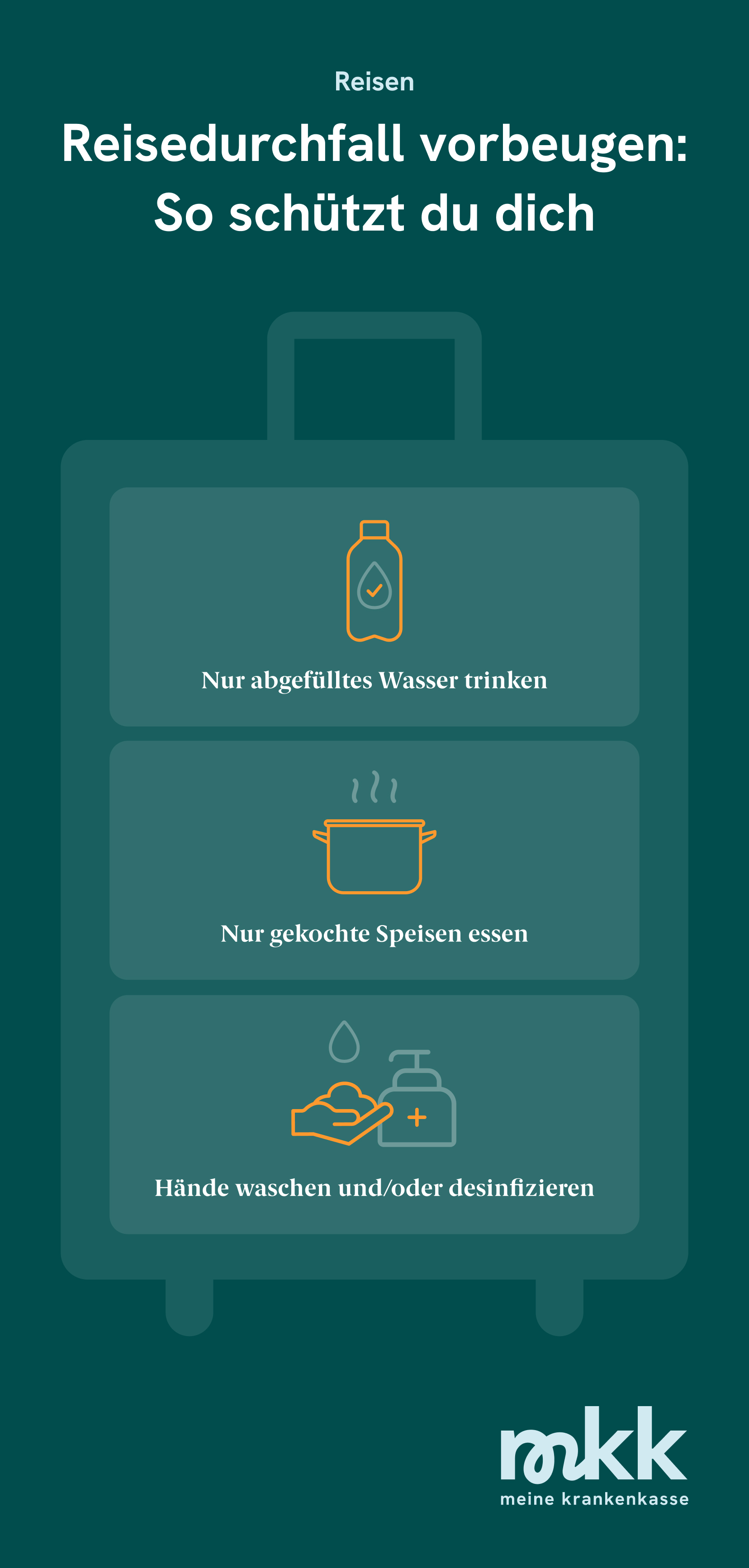 - Reiseapotheke: Eine gut ausgestattete Reiseapotheke ist Gold wert. Kohletabletten, Probiotika und Elektrolytpulver gehören genauso hinein wie eventuell benötigte Durchfallmedikamente. Damit hast du immer das richtige Mittel zur Hand, um deinen Urlaub schnell wieder genießen zu können. Hier erfährst du, was noch auf deine Reise-Checkliste gehört.